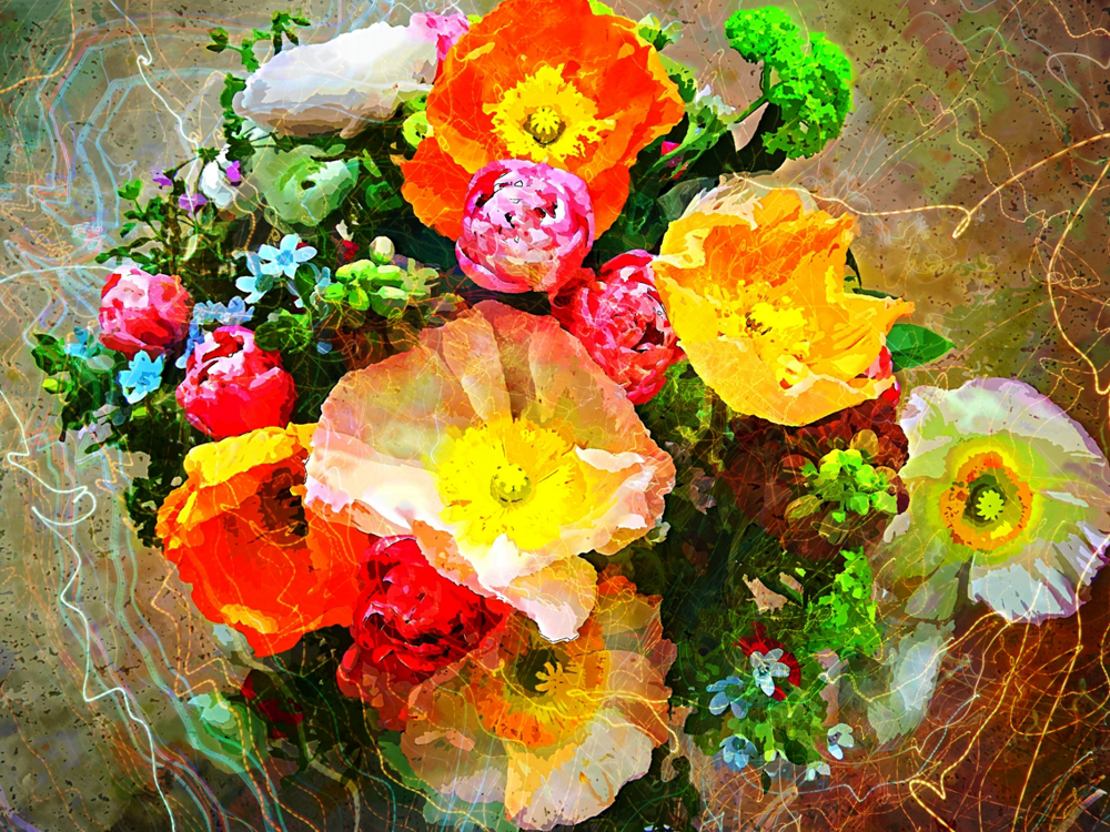 Chaque création est composée, modifiée: elle peut être renouvelée en déplaçant un motif, en changeant ou en ajoutant une autre image qui peut à son tour être travaillée avec des filtres ou des options différentes; c'est aussi l'intérêt de l'art numérique. J'ajoute ma touche personnelle en incorporant une création manuelle au milieu des images digitales, ce qui donne un rendu comparable à une peinture.